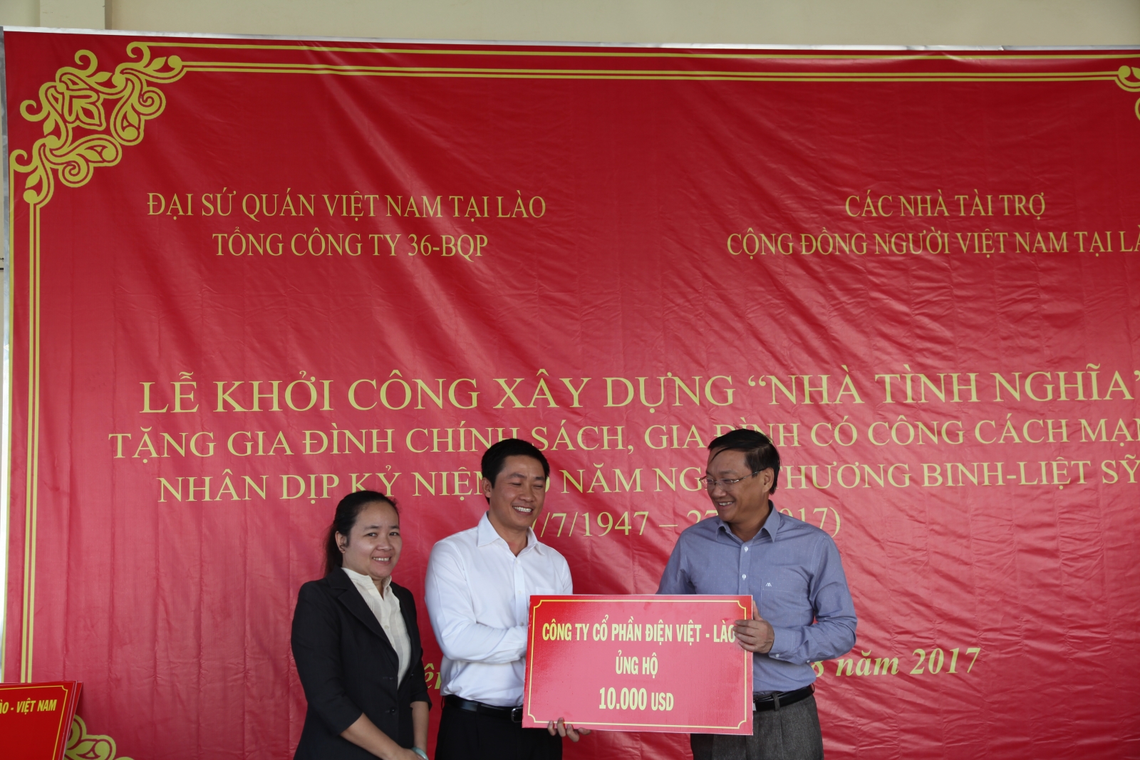 Đại sứ quán Việt Nam tại nước CHDCND Lào đã gửi Thư cảm ơn Công ty cổ phần Điện Việt Lào đã tham gia ủng hộ Dự án xây dựng “Nhà tình nghĩa” tặng gia đình chính sách, gia đình có công với Cách mạng có hoàn cảnh đặc biệt khó khăn đang sinh sống tại Lào nhân dịp kỷ niệm 70 năm ngày thương binh liệt sĩ (27/7/1947 - 27/7/2017). Theo đó, Công ty cổ phần Điện Việt Lào đã tài trợ số tiền 10.000 Đô la Mỹ để Đại sứ quán Việt Nam thực hiện Dự án xây dựng “Nhà tình nghĩa”. Đây là tấm lòng của toàn thể CBCNV Công ty Cổ phần Điện Việt Lào đối với các Gia đình chính sách, gia đình có công với Cách mạng, là nghĩa cử cao đẹp, thể hiện đạo lý “Uống nước nhớ nguồn” “Đền ơn đáp nghĩa”.